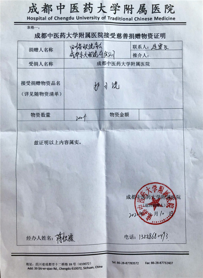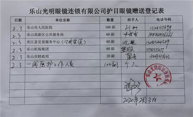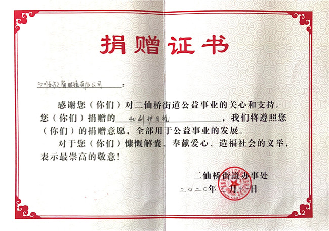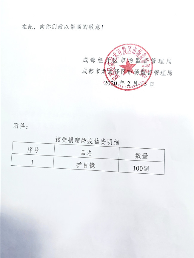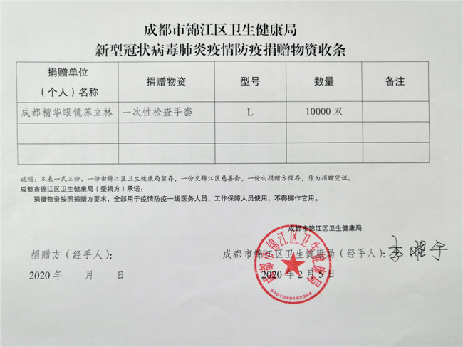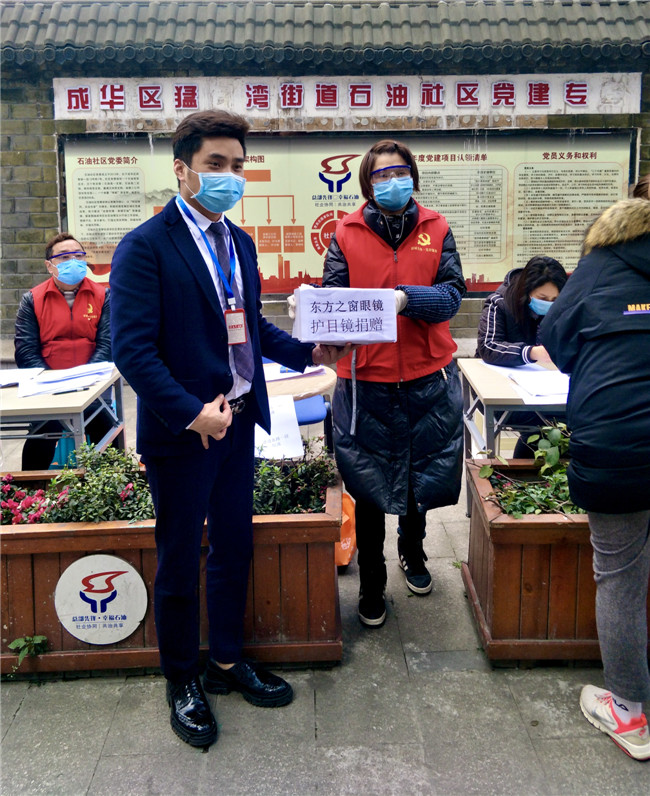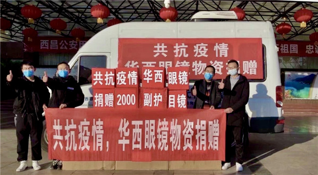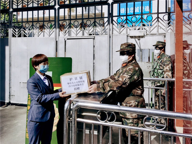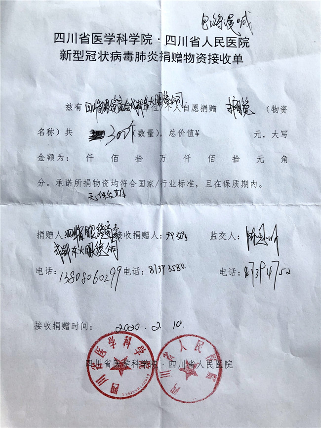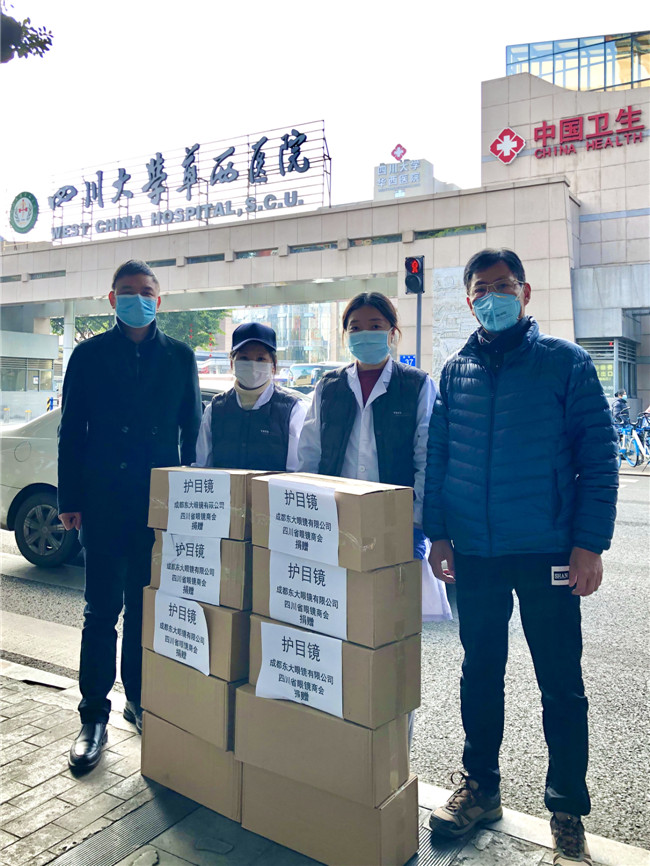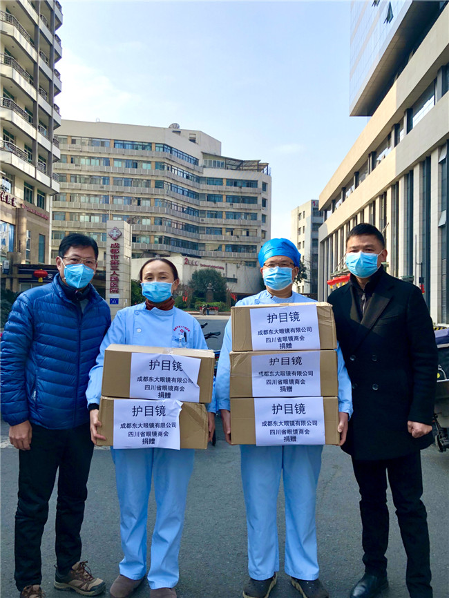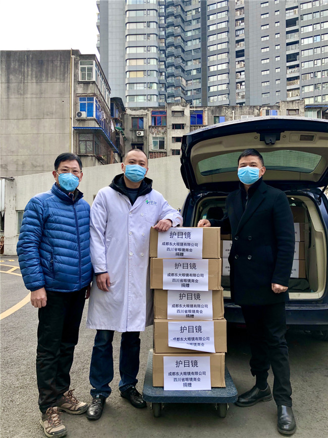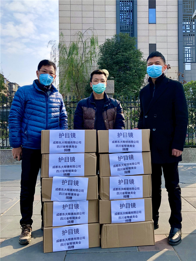 庚子年初,一场突出其来的新冠疫情席卷中国大地,打乱了全国民众的正常生活,牵动着所有人的心。面对来势汹汹的疫情,全国各地的医护人员纷纷驰援武汉。为打赢防疫阻击战加油鼓劲,向一线工作人员的健康与安全防护尽一份微薄之力,四川省眼镜商会秉承坚持社会公益事业的优良传统和高度的社会责任感,充分发挥商会的纽带作用,利用行业的整体优势,在第一时间向各会员单位和业界同仁发出关于抗击新型肺炎疫情倡议书,号召各会员单位全力参与支持抗击疫情工作。 商会及各地会员单位积极行动起来,向各所在地医院、公安、武警、街道、社区、小区、环卫、卫生服务中心、卫键部门、市场监管局、城管局、红十字会、工商联等一线人员,近100家单位捐赠了防护物资。2月10日,商会会长杨亦米、秘书长彭良亲自将800副护目镜送到四川省医学科学院.四川省人医院、成都中医药大学附属医院、成都市第三人民医院、四川大学华西医院,用于疫情防控一线医护人员的安全防护。据不完全统计,我商有34家会员单位和6位企业家,共为疫情防控捐赠:护目镜14138副,口罩1400个,一次性手套10000双,84消毒片4000粒,拭镜纸74700片,共计价值近60万元,现金捐款61.37万元,累计捐款捐物金额逾120万元。