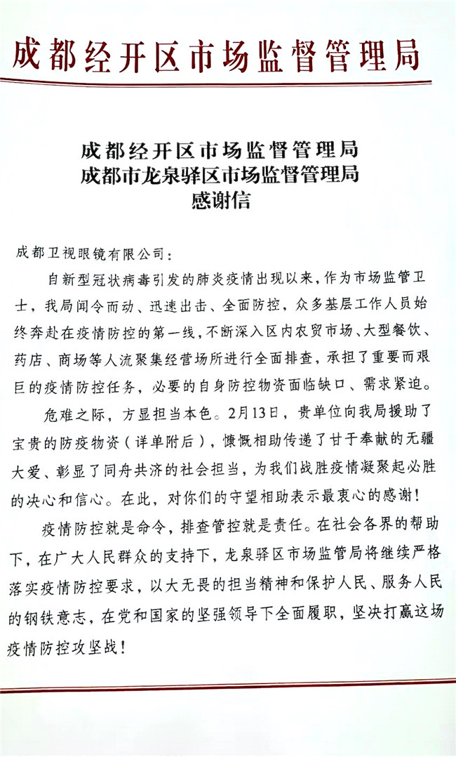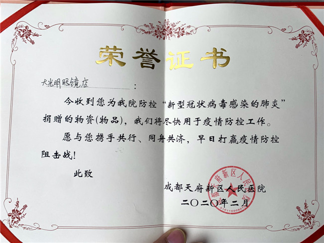 部分证明材料七 疫情无情人有情,我商会及全省眼镜行业同仁,将继续携起手来,坚持在以习总书记为核心的党中央领导下,按照从省委、省政府的统一布署,同舟共济,齐心协力,为赢得疫情防控阻击战的最终胜利而做出自己最大的贡献!