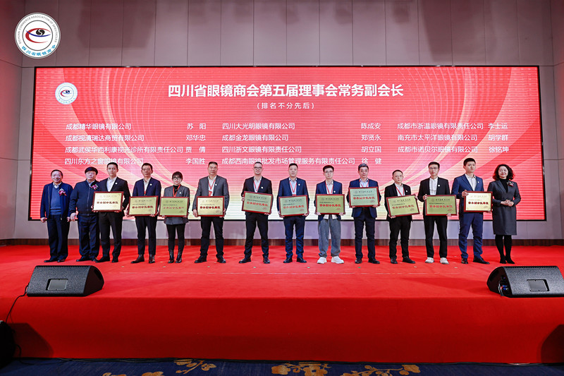 廖励理事长为爱心企业和单位颁发证书 四川省眼镜商会换届选举大会暨四川省眼镜商会第五届一次会员代表大会成功召开,为四川省眼镜商会的发展注入了新的活力。相信在新一届领导班子的带领下,商会将继续发挥桥梁和纽带作用,团结广大会员企业,携手共进,共创辉煌! 最后,杨亦米会长携新一届领导班子成员集体亮相!